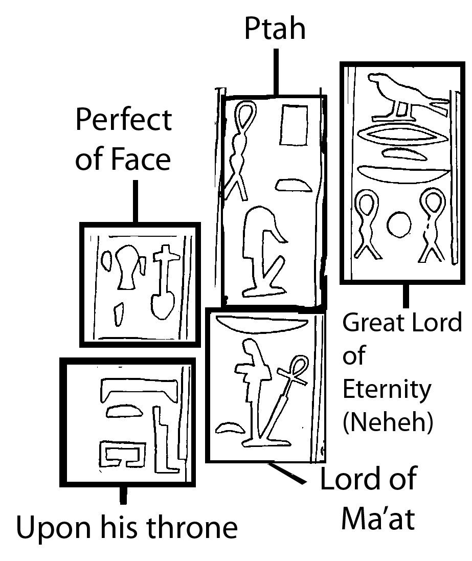 Ptah, Lord of Ma'at, Perfect of Face, Upon his Throne, Great Lord of Eternity.