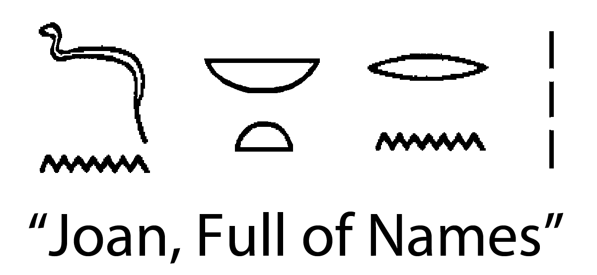Coming around the bend, trying to see where I'm going. Names, what do I want to say about names? "Joan, full of names" (Joan (dj-n), nebet ren |||) Thinking that I take with my small hands these big ideas, and chew, chew, chew. Chew thoroughly, awful painful if it gets "stuck" on the way down. By what have I been called, by what I've chosen to call myself, names that were given, names that were chosen?