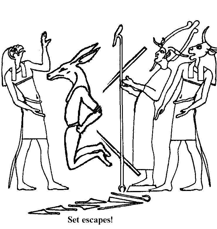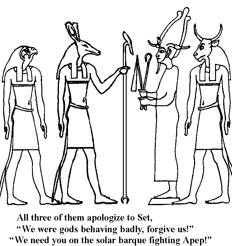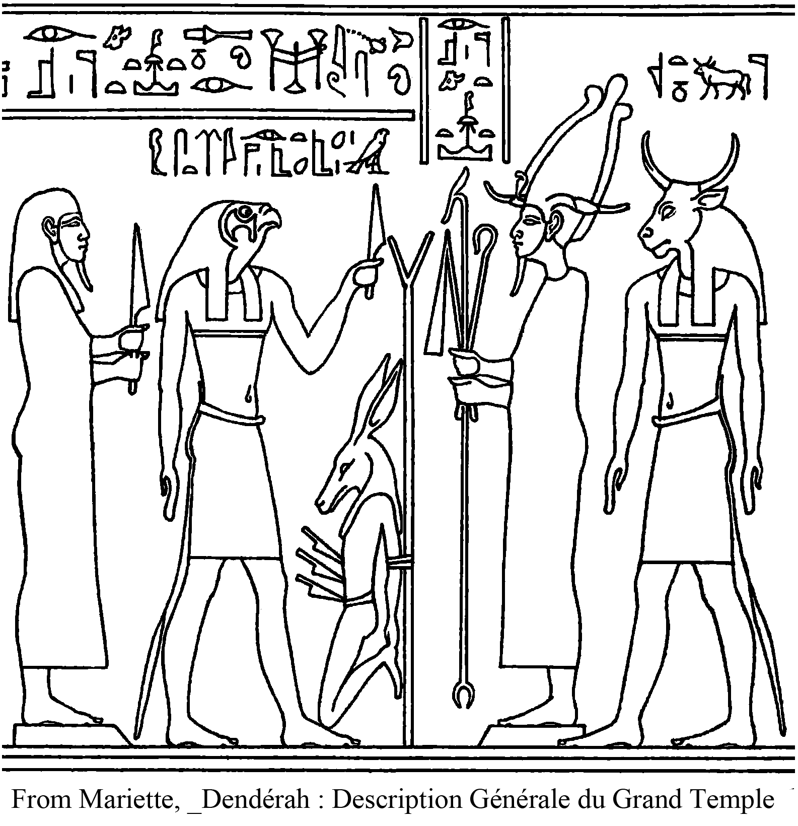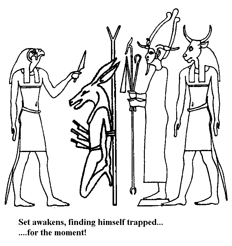 This is a de-execretion ritual. I found Ritner's _Mechanics of Ancient Egyptian Magical Practice_ very useful. But its cover has always bothered me. Set is trussed up and Horus is sticking him with daggers. Bad Horus! He once chopped off Mama Isis' head because she dared to defend her brother in their contendings. Isis (Aset) isn't there at this scenario, nor is Thoth, nor is Ma'at. Osiris is, and some other god who I don't recognize. (In addition, the four sons of Horus are also there, supplying daggers. I found Mariette's original, and have a crop showing one of the four sons.) I'm not sure why Horus' bad behavior was being given voice at Dendera. Maybe he was mad about Set's necessary role in Osiris' destiny. But it's time to put it right: