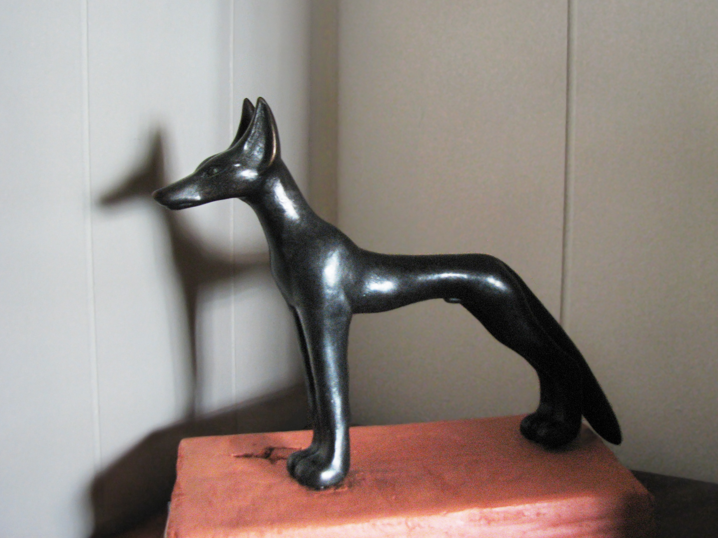 It's taken some doing, but at last I've got Wepwawet's statue upright. I tried to have a pretty base, but apparently I wasn't able to make myself clear as to what I needed. I said many times, "There has to be room for the tail to hang over the edge!" I though I'd made myself clear about the back right foot/front left foot alignment, but apparently I failed to communicate on that score, too.