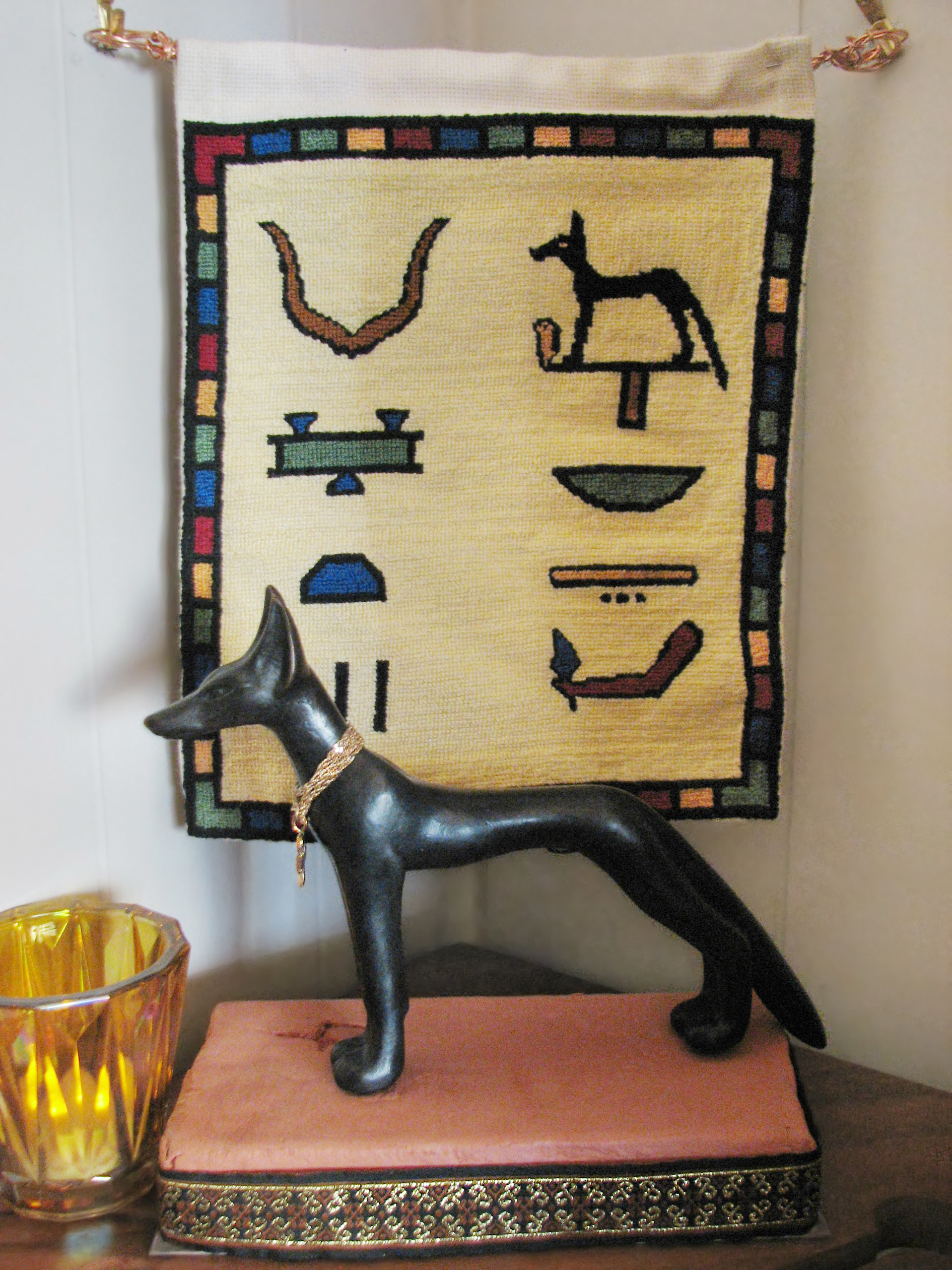 December 24, 2016 On solstice morning, I felt moved to hang the tapestry up. I took down all the pictures and moved the statue of Wepwawet. It was difficult to get the picture hooks in. Perhaps there's thick wall struts in just those two places. When I put Hathor's tapestry up, she will go on the flat wall to the left. It will be some time before that happens, however. I'm still in the transcribing phase: