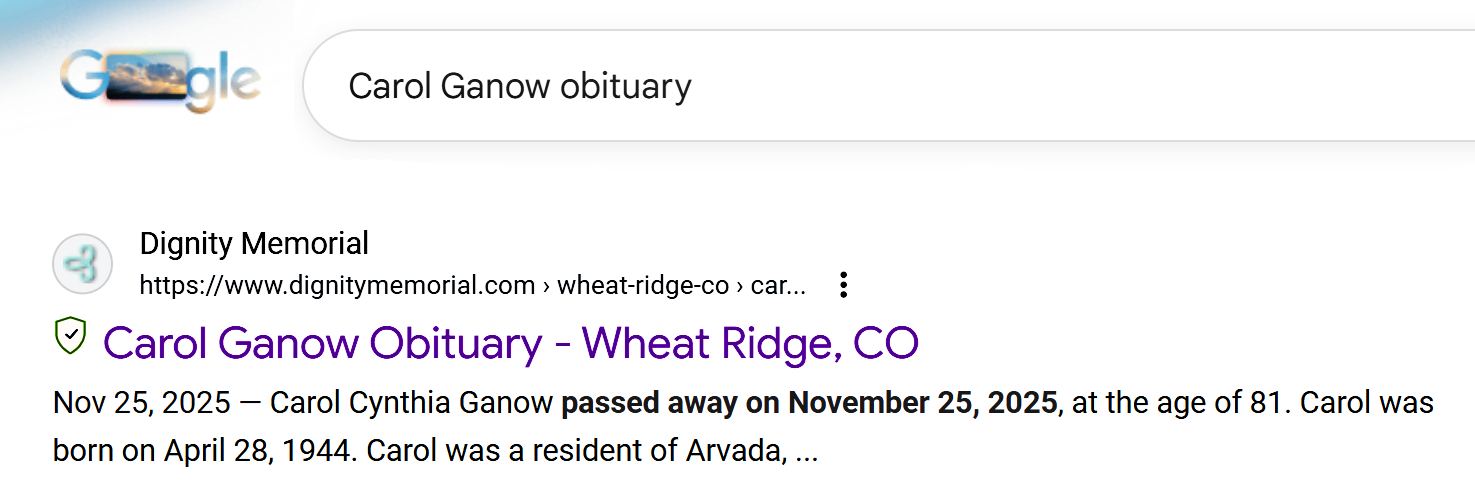 "Carol Cynthia Ganow passed away on November 25, 2025, at the age of 81. Carol was born on April 28, 1944."