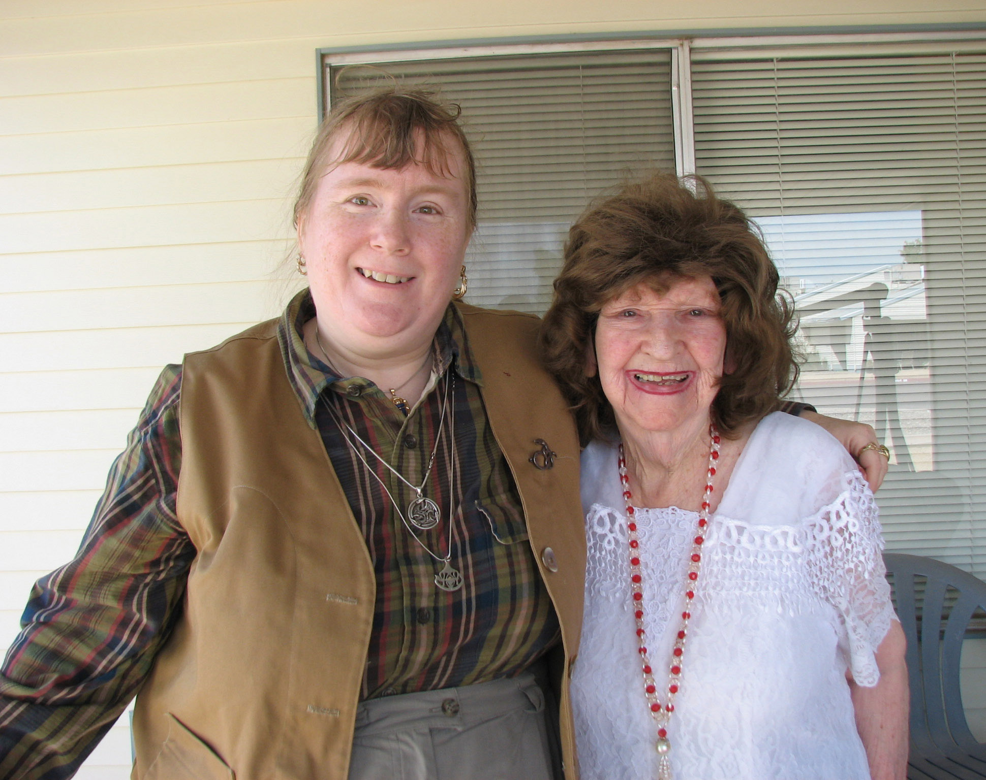 | April 2007, Julia and I had a nice visit with Eleanor, Laura's mother. She lived in a pleasant apartment complex, each of them scattered like small homes through out a nicely landscaped area. She had her swing on the porch, and she decorated the inside very nicely, despite not being able to see very well. We took pictures of each other with Eleanor just before we left. |