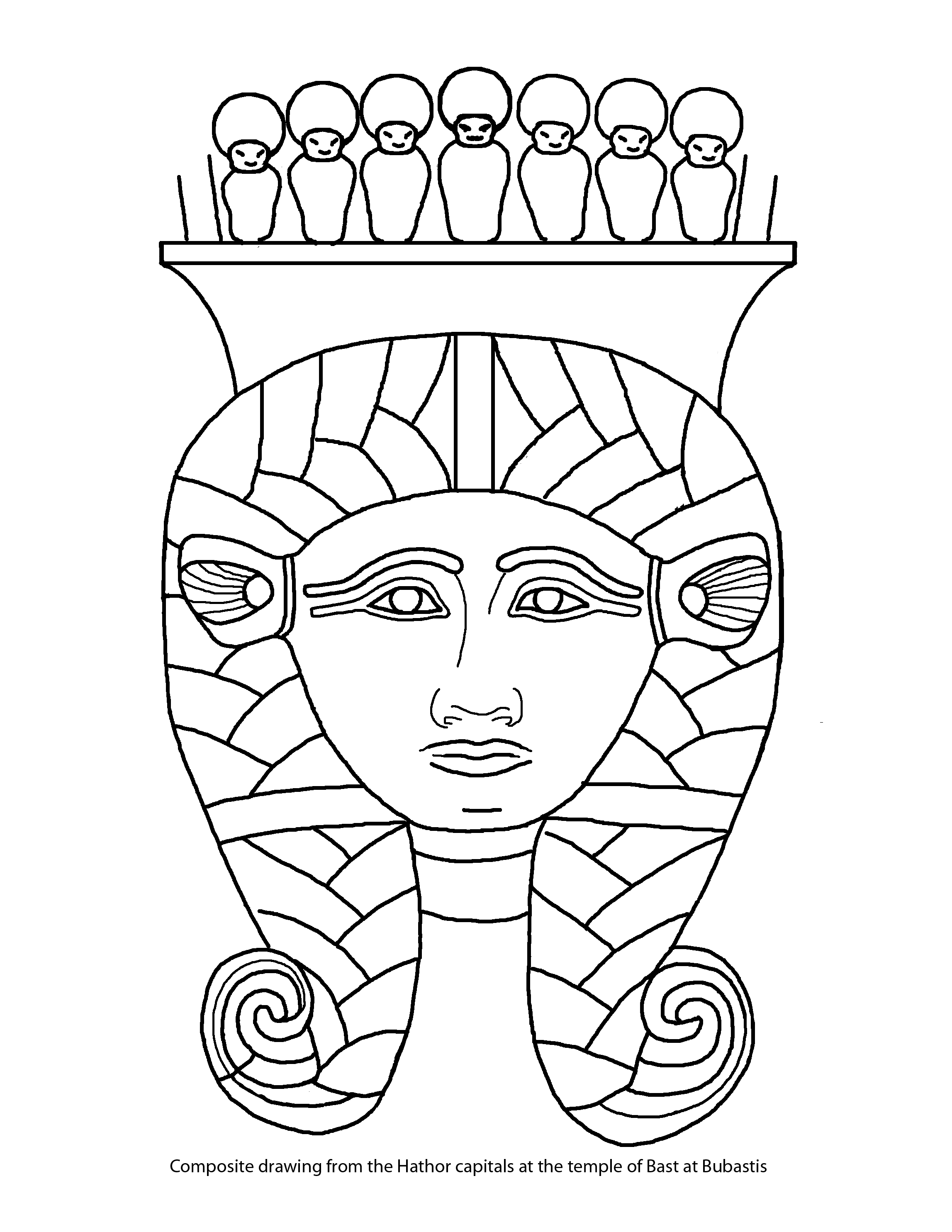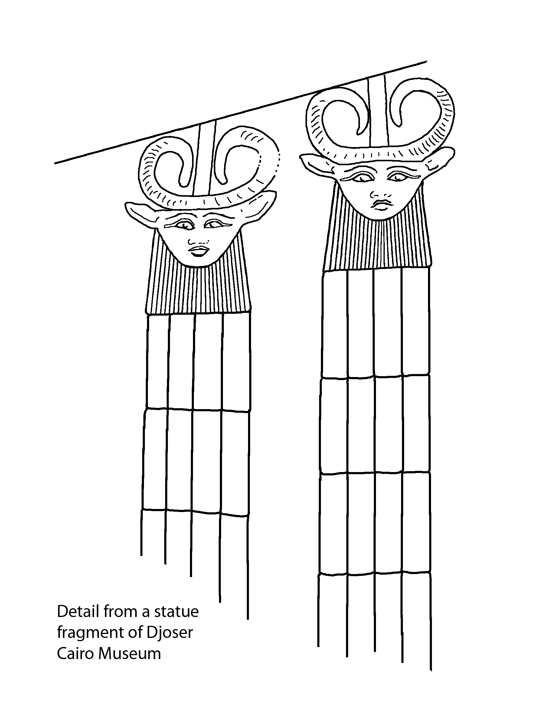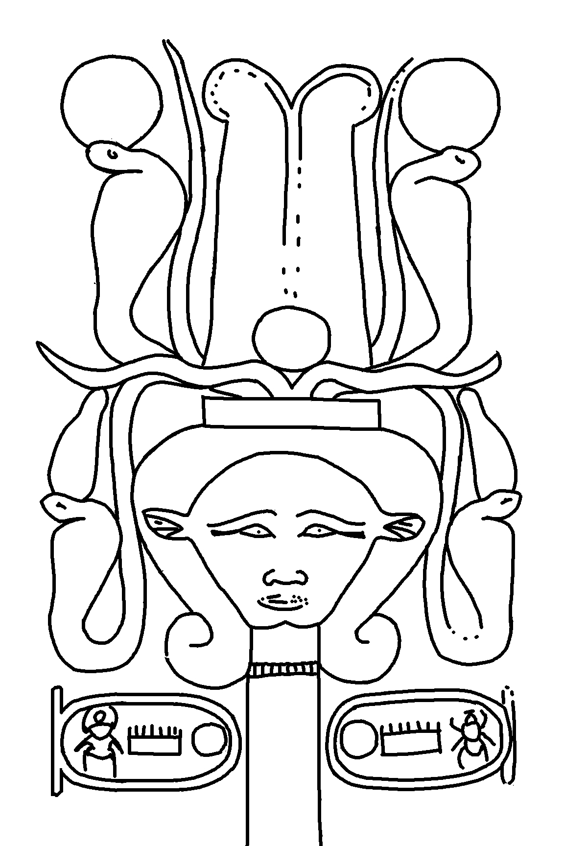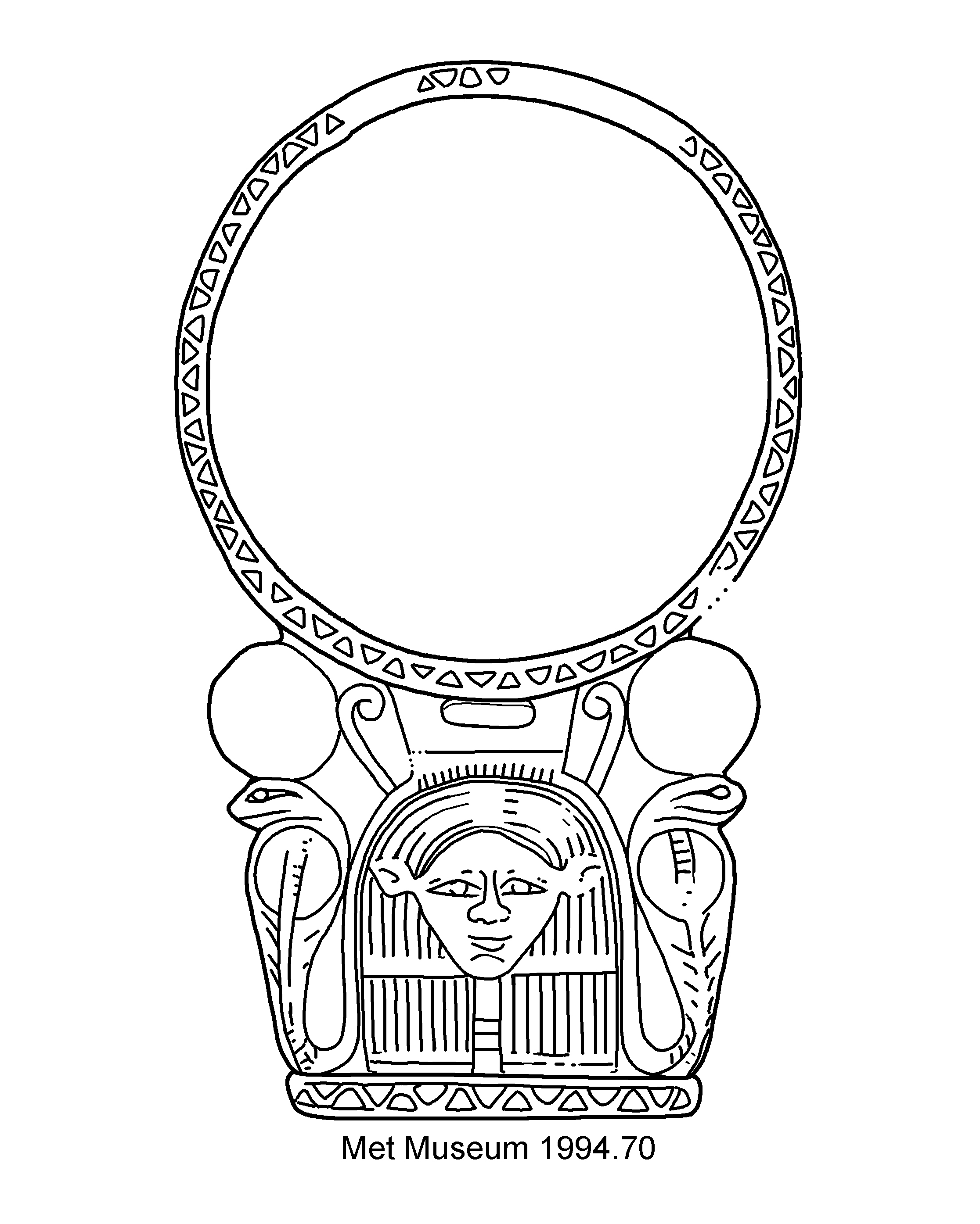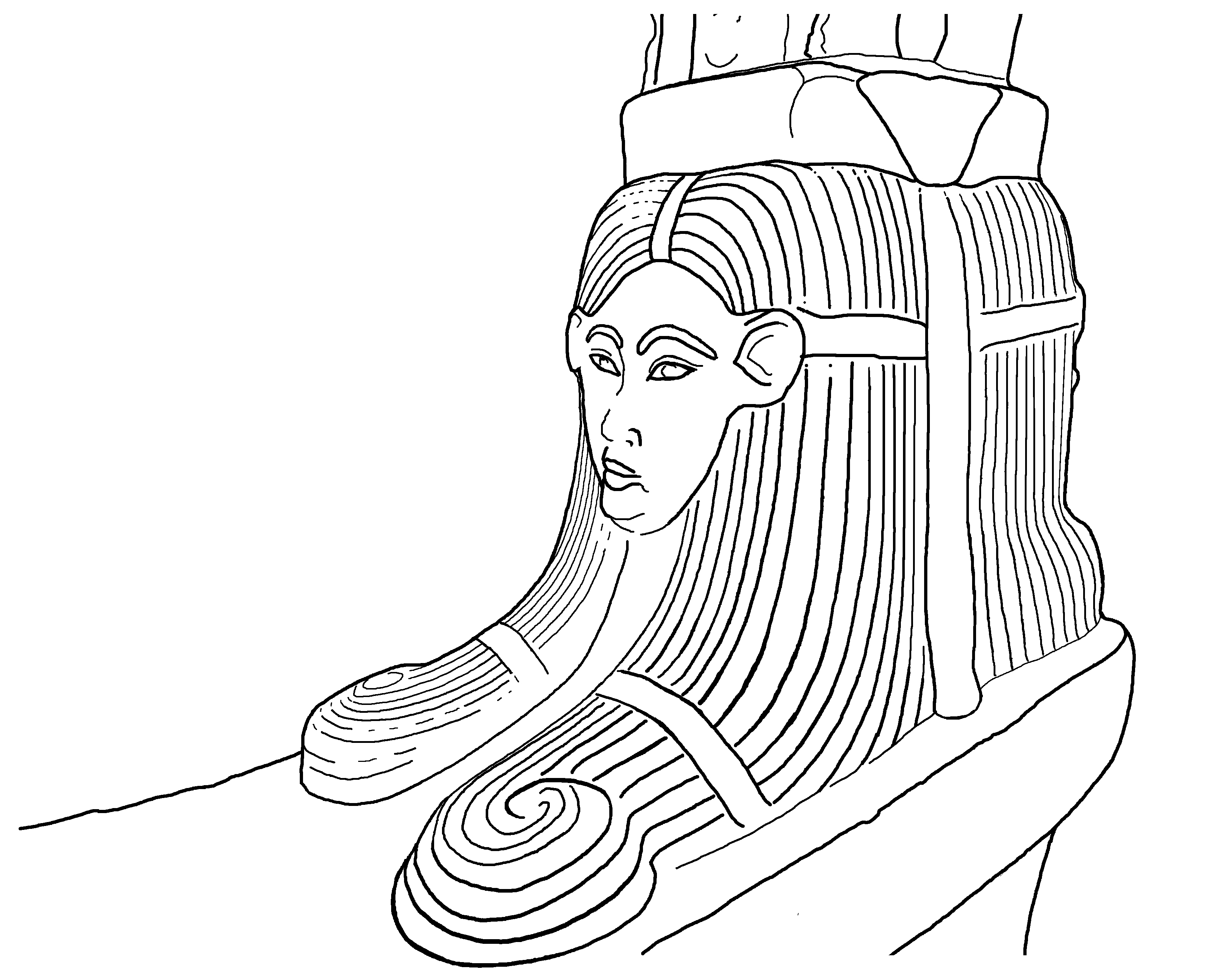 There are six of these capitals in museums, plus several sad fragments still extant in the Bubastis open air museum. I've found, besides the one at MFA which I've seen and snapped, capitals at the British Museum, the Louvre and the Australian Nicholson museum. In _The Encyclopedia of Ancient Egyptian Architective_ Dieter Arnold gives the museum and accession numbers of two more Bubastis Hathor capitals, Berlin's Ägyptisches Museum #10834; and Cairo's JE 72134, in the museum's gardens. By referencing many different photos of these pieces, I've come up with this composite drawing. The capital at the Nicholson museum might not have had a row of uraei, the break is a very clean one. But the other three show seven uraei from the front view and the Louvre example shows five uraei from the side view, along with a papyrus scepter at the center and two crowned uraei on each side of the scepter, such that these two show from the front view. I opted not to include these side uraei in my trace. It's uncertain if the capital at the Nicholson museum had them originally. The curving side lines probably represent the curved lines in the sistrum as in Nebnefer's block. Nebnefer's cube is clearly from the 18th Dynasty, in the time of Amenhotep (Amenophis) III's reign (1390-1352 BCE), as it contains a rebus, "Beloved of Nebmaatre". Edouard Naville, who excavated the Bubastis columns in 1887-1888, thought these also did, even though today credit is given to Osorkon of Dynasty 22, reign of Osorkon, (874–712 BCE). Osorkon, like so many before him, might have simply usurped them. "Besides, it cannot be denied that the Hathor capital with two faces of the goddess is met with in temples of the eighteenth dynasty, at Deir el Bahari, where it dates probably from Hashepsu or Thothmes III., at El Kab and Sedeinga, where it dates from Amenophis III. In the last two instances there is another similarity with the Hathors of Bubastis, the two sides which have not the face of the goddess bear the emblematic plants of North and South. Under such circumstances it may well be asked whether the colonnade of Bubastis is not the work of the eighteenth dynasty, and of Amenophis III, whose name is preserved on several statues discovered in the excavations." (Edouard Naville, Bubastis: Eighth Memoir of The Egypt Exploration Fund, (London, Gilbert and Rivington 1891), page 13) I'm inclined to agree with Naville. The mouths have that distinctive full Amenhotep look!