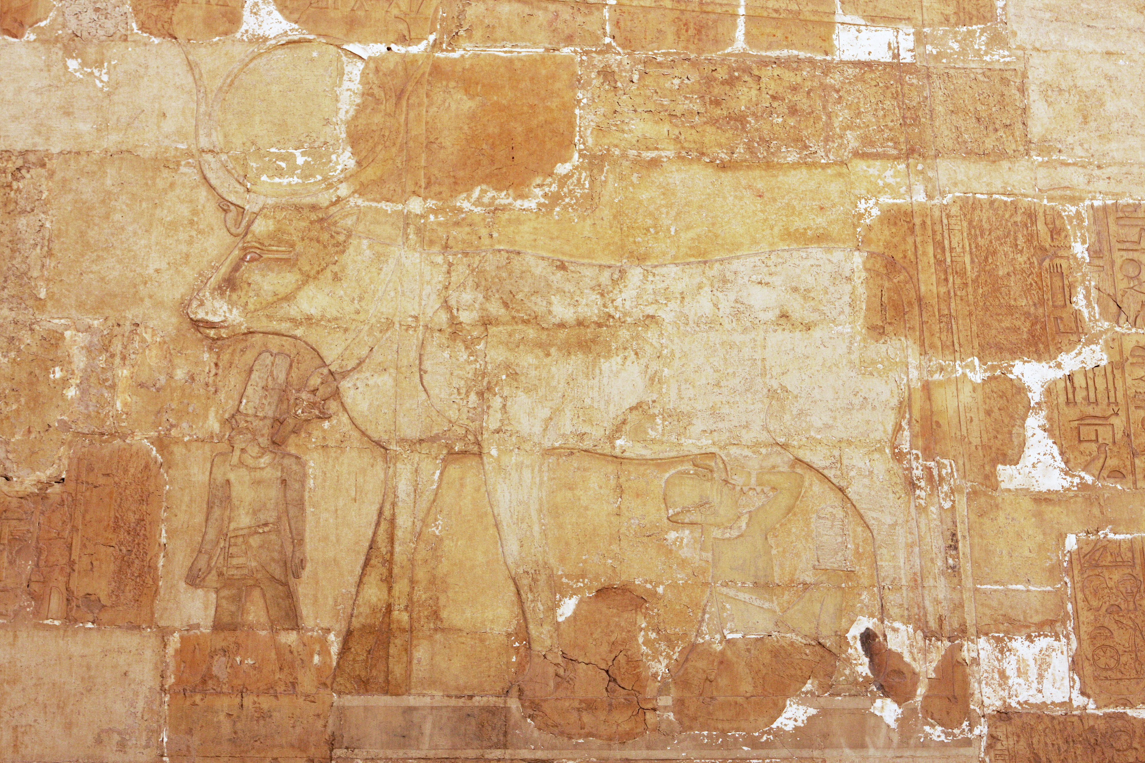 "Suckled by the divine cow, Hatshepsut receives the gifts of life and strength as well as the power of the transfigured Akhu.17"