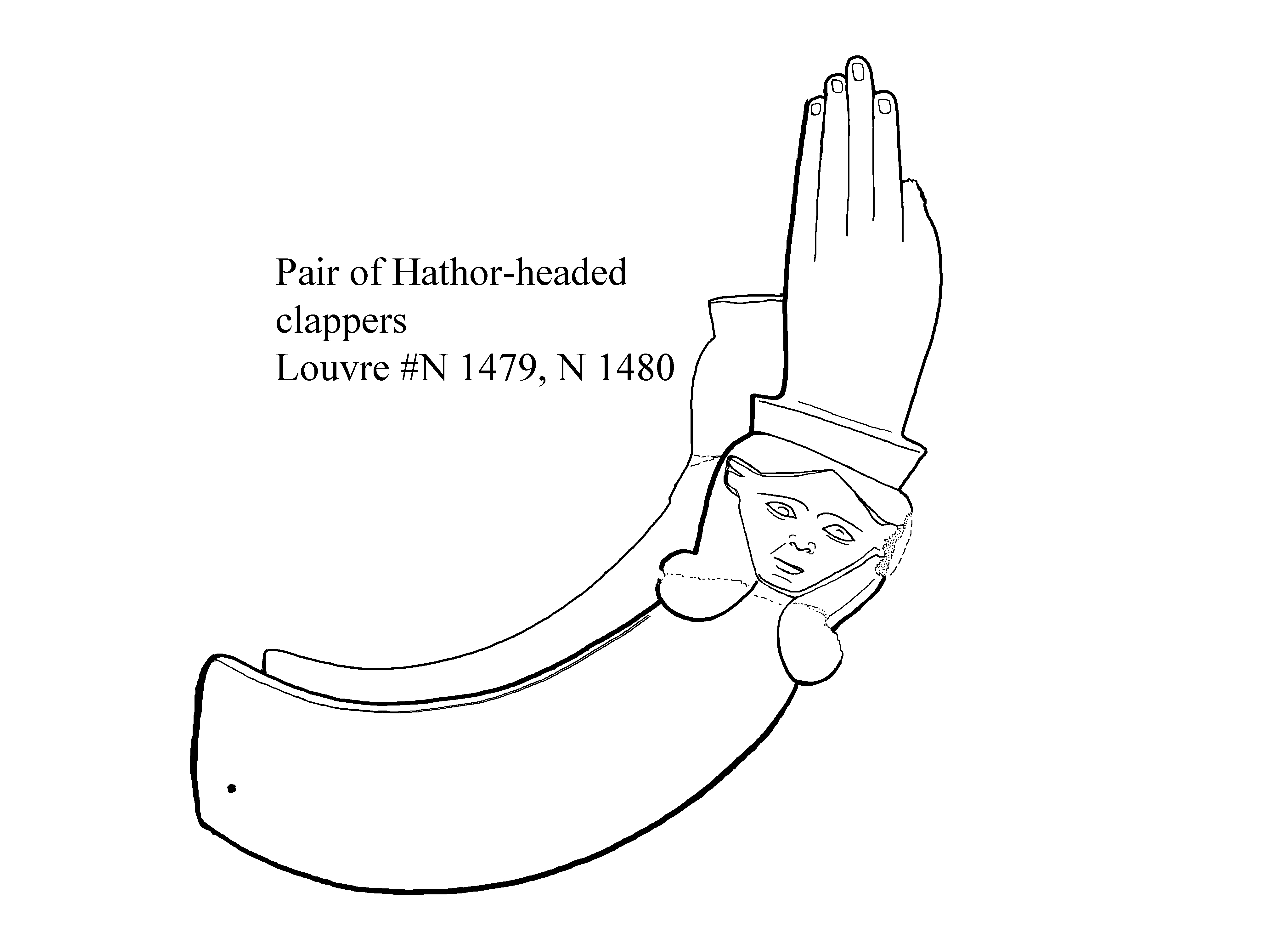 ![]() Pair of clappers with the head of the goddess Hathor Middle or New Kingdom? 2033 - 1069 BCE Ivory from hippopotomus teeth, Height: 35,40 cm.; Length: 7,40 cm. Louvre, # N 1479, N 1480 Traced from a photo by Heidi Kontkanon Andrea "Amberinsea" has a view of the front side of the other clapper I'm finding the imagery for the goddess Hathor rich and varied. These two clappers are curved, due to the shape of the hippopotamus ivory with which they were carved. Each end was originally decorated with the head of the goddess Hathor and a slender hand, although the one clapper has since lost its hand. In antiquity they would have been held together by a cord inserted through a tiny hole each has at the end. They would have been used as a percussion instrument by clapping them together. Clappers like these "seem to be the first musical instruments to have been depicted on vases, as early in the predynastic period. Clappers with hands appeared in the Middle Kingdom, yet it seems that the most beautiful of these objects can be dated to the New Kingdom, particularly those representing a head of Hathor. Music and dance played an important role in ancient Egypt..." (From the museum website) Bleeker quotes an excerpt from a "song sung by the seven Hathors to the great goddess Hathor":