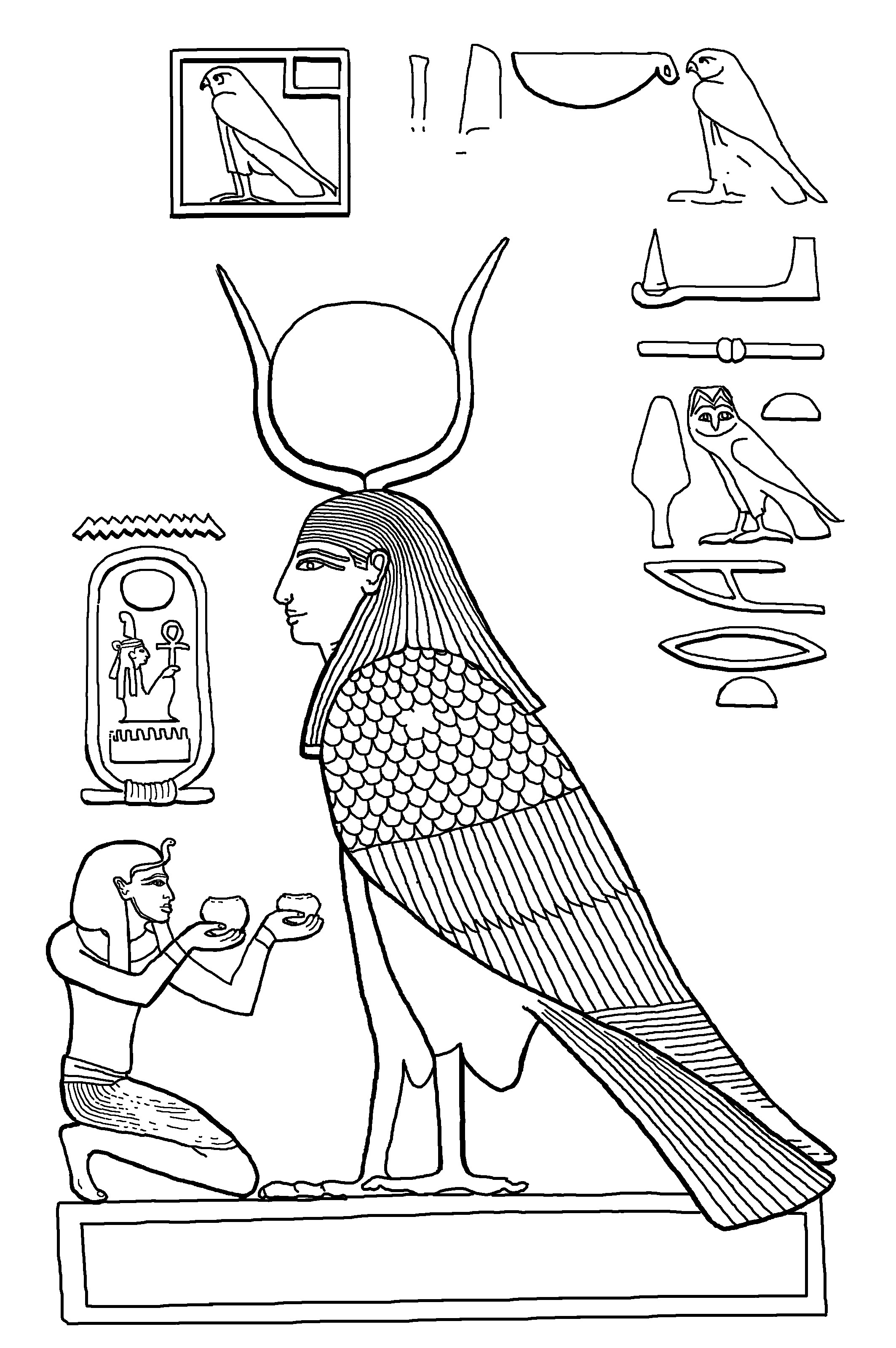 "Plate 40 shows Seti kneeling devoutly before Hathor, 'the female Hawk', who appears in the form of a human-headed Ba-bird. Between the king and the goddess are inscribed the words