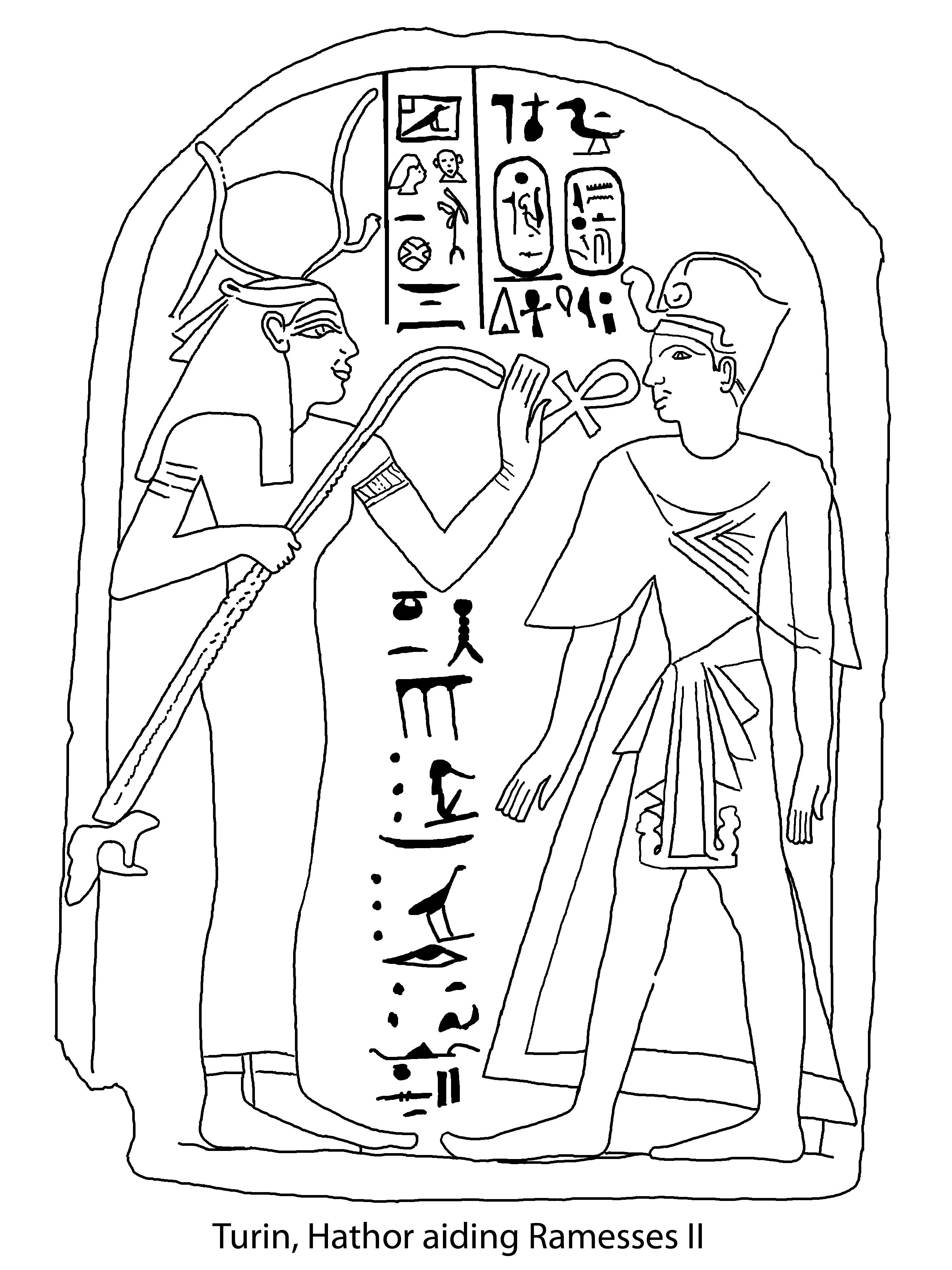 I admit the artist of this stela wasn't the best. Hathor's ears are too high, the pharaoh's eyes are out of place, and the glyphs aren't very clear. One photographer thought the cartouche could be saying "Amenhotep", while the other ventured "Ramesses II". "Amen" can plainly be seen. But more of the glyphs resemble those of Ramesses, so I'm going with that.