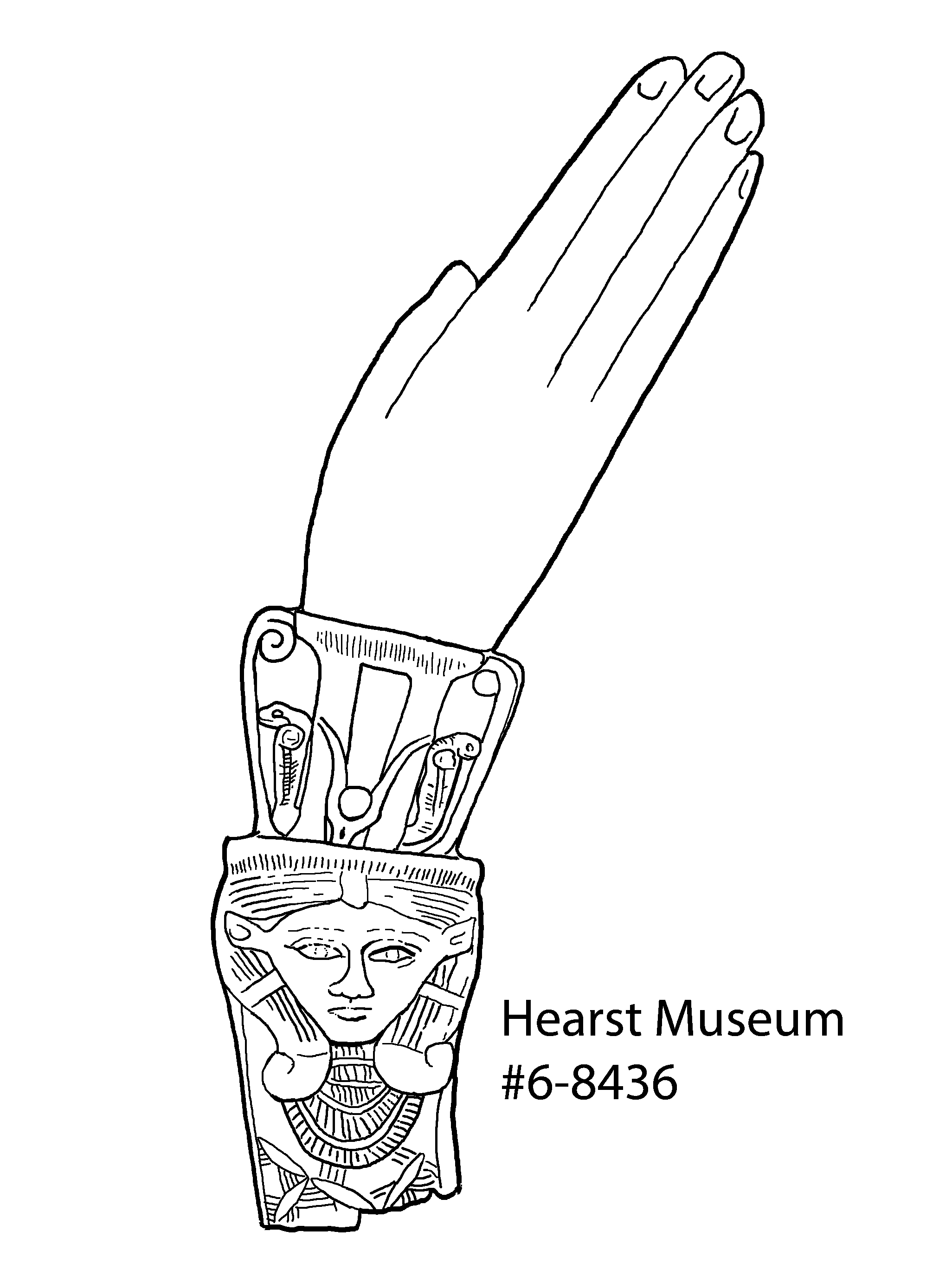 The Phoebe Apperson Hearst Museum of Anthropology has a broken clapper, but the part that remains has exquisite detailing. Hathor wears an elaborate collar, and the sistrum area has been elaborated with uraei.