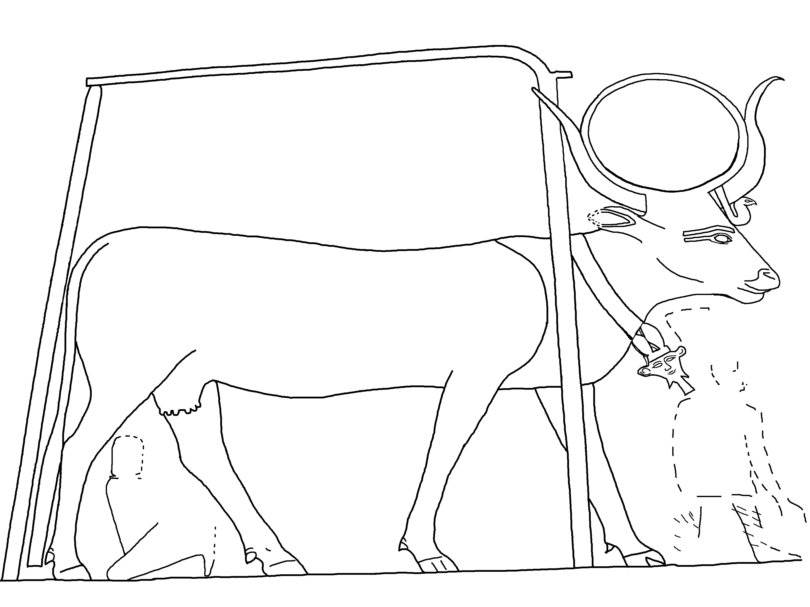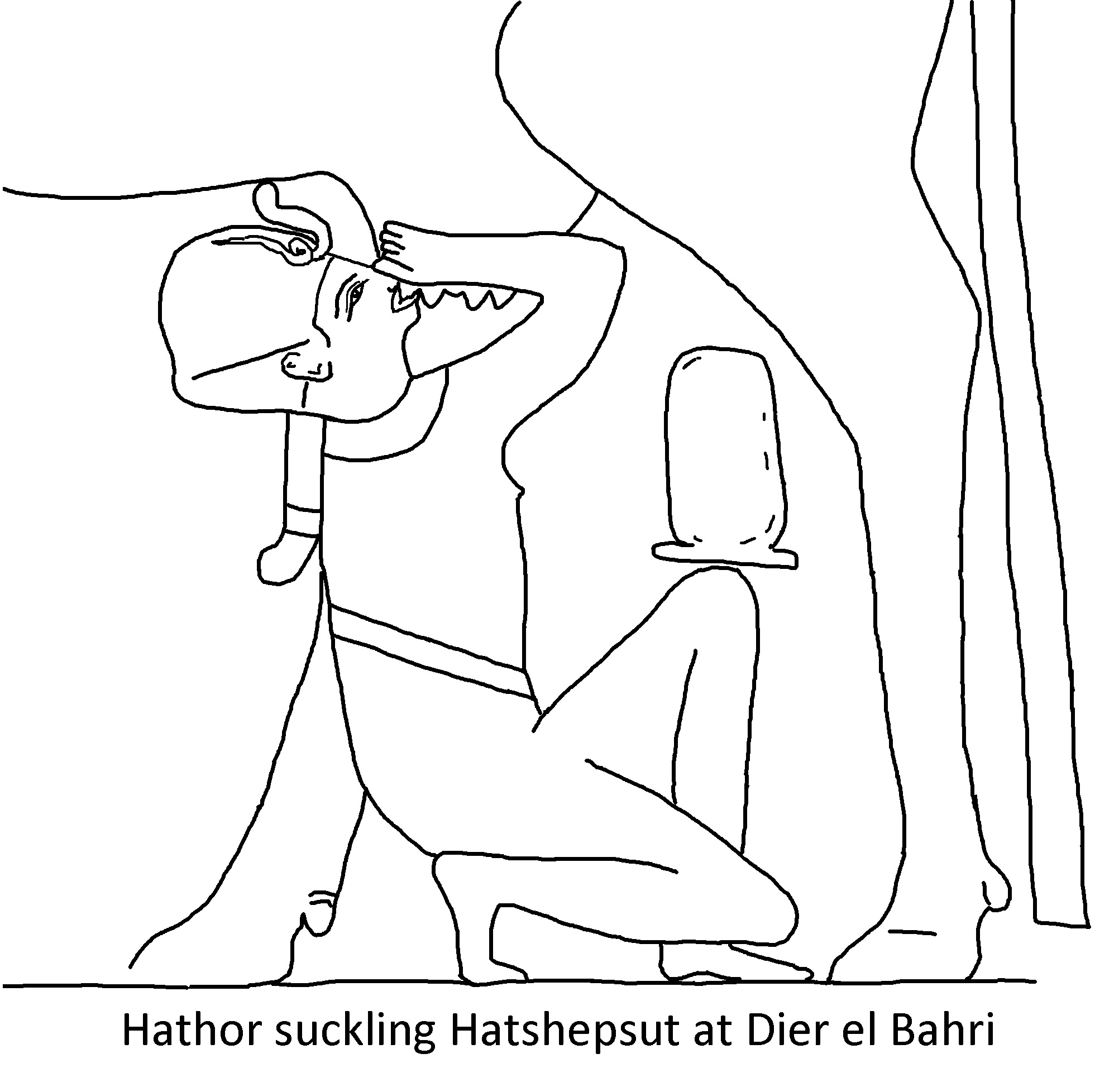 "The Hathor chapel of the Deir el-Bahari temple of Hatshepsut is the earliest known structure dedicated to that goddess on the west bank.12 Depicted in the form of a cow, she is titled Hathor of Dendera, Chieftainess of Thebes. As the protective and nourishing mother, she is shown licking the queen, as the cow does her calf.13 Cattle references are prominent in the accompanying texts, where Hathor is referred to as the Tjenenet cow and Apis is the Tjenen bull, "who engendered the heifers."14 Anubis is also cited here as the 'Lord of the Horned Ones, who resides in the land of the heifer.'15 The birth of Horus in the marshes is the underlying theme of these scenes. The goddess kisses the queen, 'as I did for Horus in the nest at Chemmis.' Hatshepsut, the child of the divine cow, is 'my Horus of Gold.'16