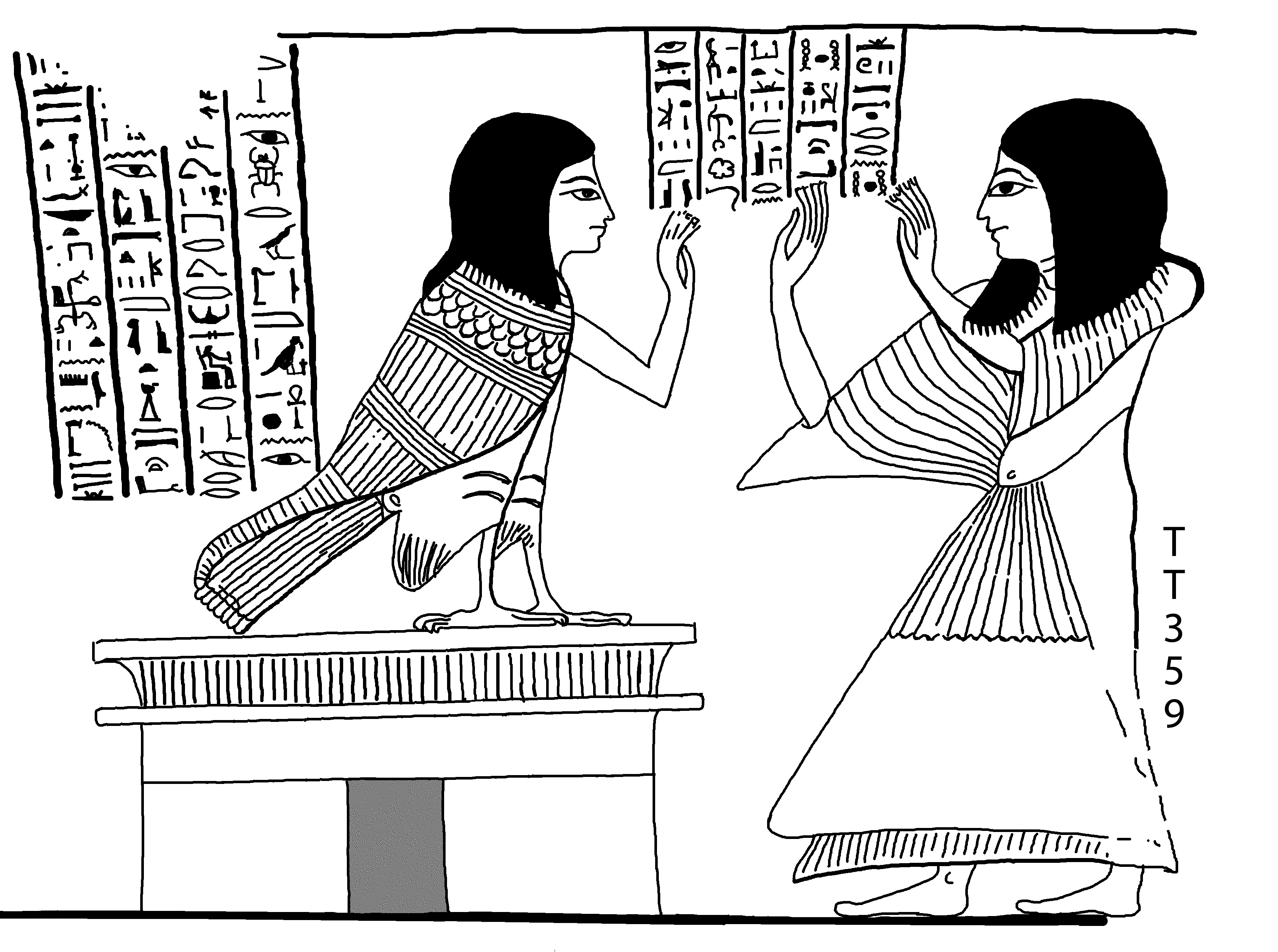 Alison Roberts describes this: "Vignette from chapter 26 of the Book of the Dead, equaled with the ninth hour of the night. A chapter of the heart, it begins with the words 'May my heart be mine in the House of Hearts'/ Holding her heart, the lady Taameniu kneels before her Ba, which wears a Djed symbol of 'stability', symbolizing her stable existence..." (page 153)