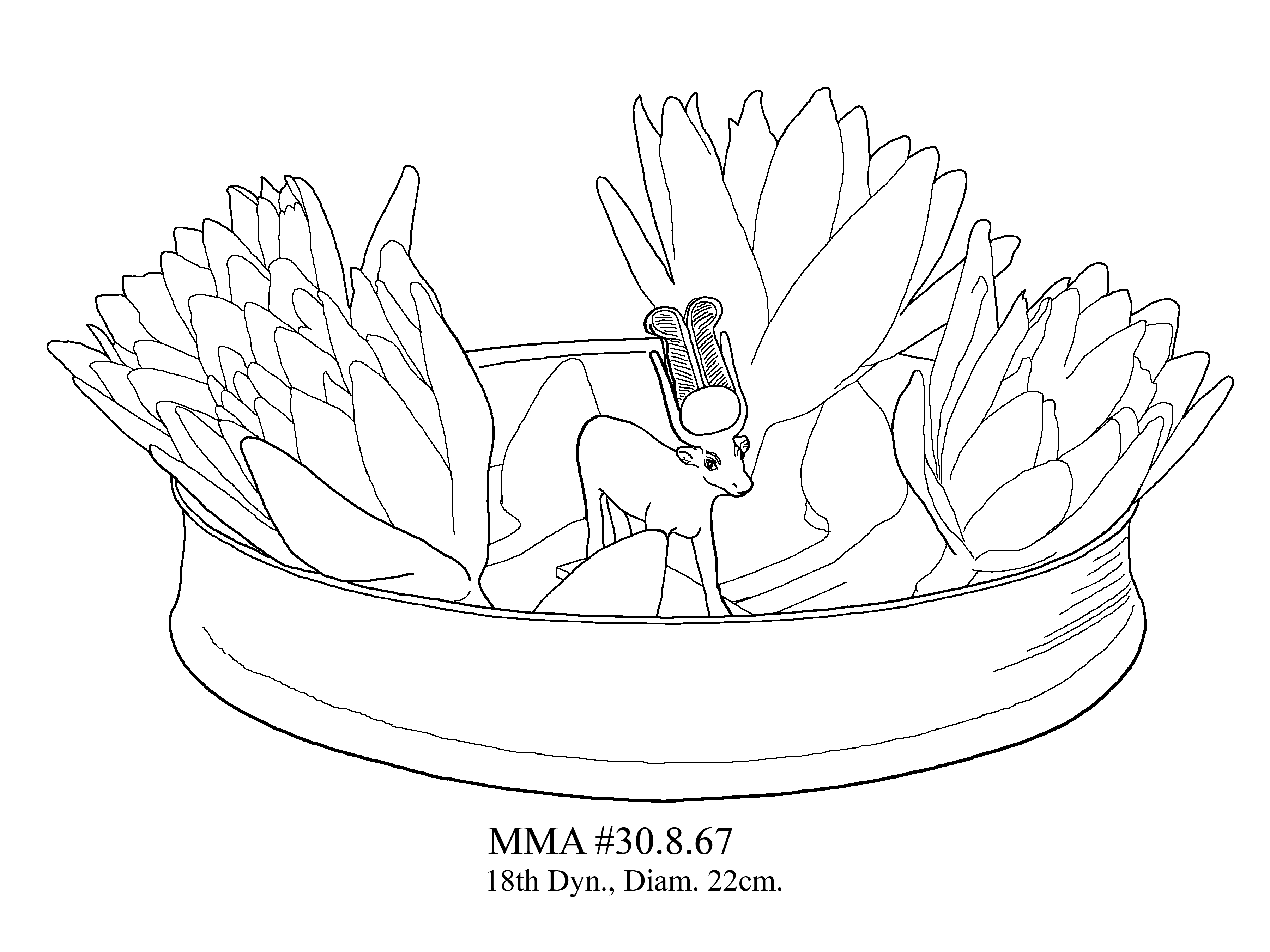 "The interesting bronze *flower bowl of figure 121, found with two others in the forecourt of the tomb of the Vizier Rekhmi-Re, was apparently designed as a votive offering to the goddess Hat-Hor and has as its centerpiece a little bronze figure of the Hat-Hor cow crowned with the solar disk and double plume and raised above the bottom of the bowl on a small metal bridge. When the bowl is partly filled with water and with flowers the animal appears to be standing in the midst of a marshy thicket, reminiscent of the thickets of Chemmis, where Hathor is reported to have nursed the infant Horus..." (William C. Hayes, _The Scepter of Egypt_ Part II, (Metropolitan Museum Press 1959), pages 205-206)