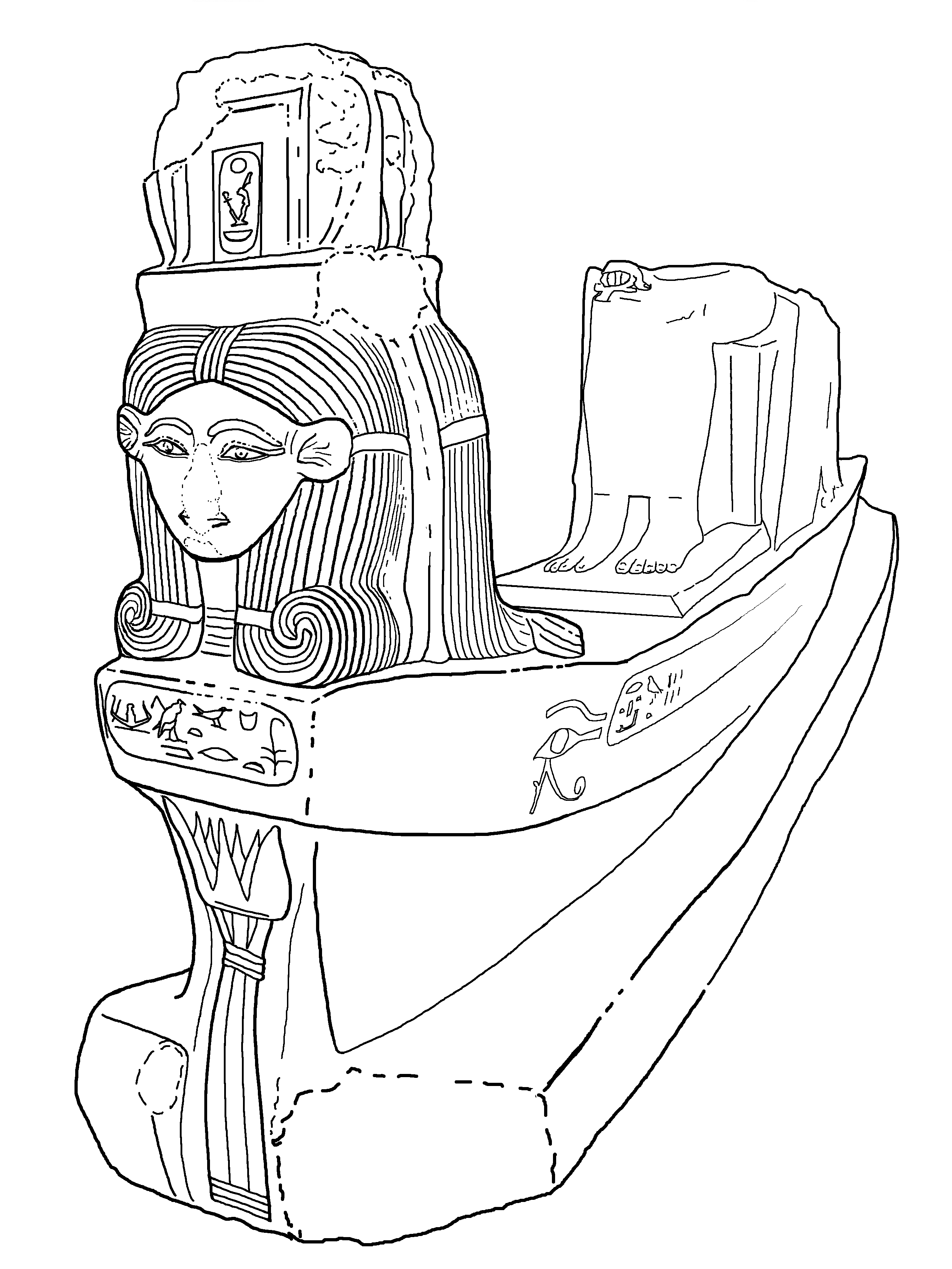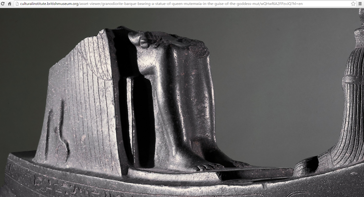The cartouche below Hathor's face says "Great Royal Wife Mutemwia". The view from the front of the barque reveals the cartouche of "NebMaatRa" within the Hathor sistrum. So he likely had this piece commissioned when he was king, as he did so many other magnificent pieces. It's an amazing sculpture, a play on words, for Amenhotep III's mother's name "Mutemwia" means 'Mut is in the barque', and that's how she is depicted. It's too bad her torso and head are lost, but we can see that she is enthroned, holding an ankh and embraced by Mut in the form of a vulture: