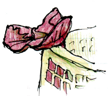 No pink flower, this, though it seems to bloom - sleeve's end ruffle overhanging laundry basket. JAL, 12-28-01